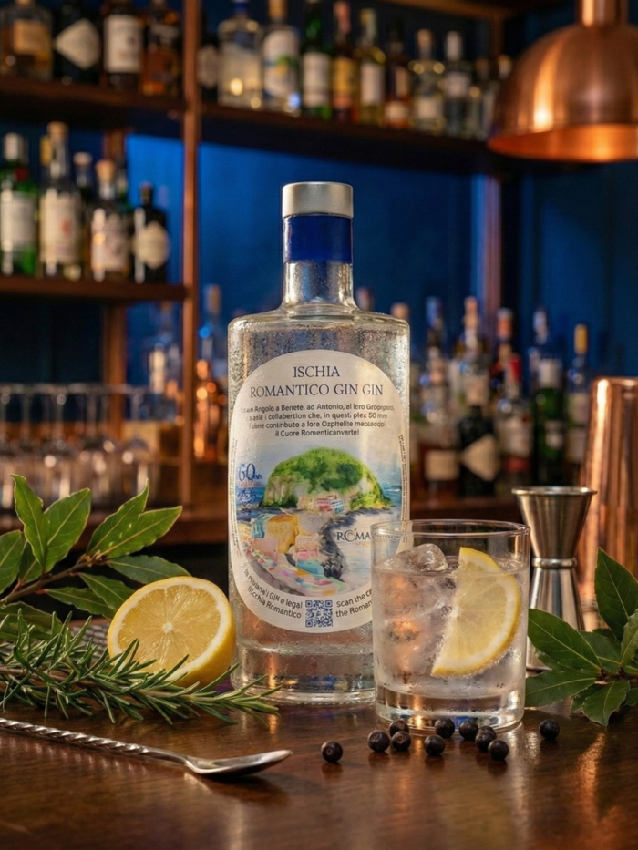 Per festeggiare i 60 anni di Romantica abbiamo creato in collaborazione con Ischia Sapori un gin botanico dalle note squisitamente Ischitane: rucola selvatica, pipernia (timo selvatico ischitano) limone e corbezzolo.